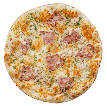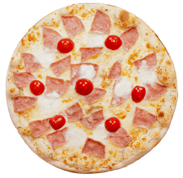 Česnakin padaž, sūris ,virtas kumpis, mocarela šviež, pomidoriukai, picos prieskoniai.