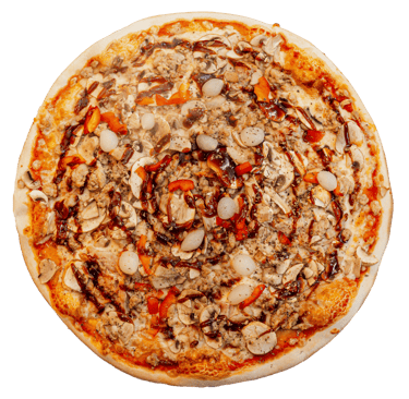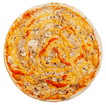 Trinti pom, sūris ,vištiena, pievagrybiai, paprika, čipotle padažas, picos prieskoniai.