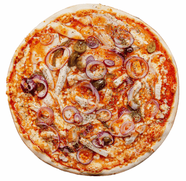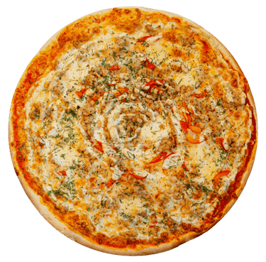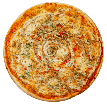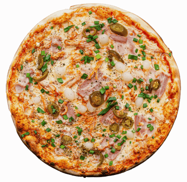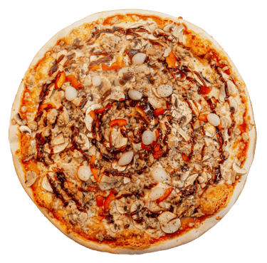 Trinti pom, sūris, kepta vištiena, rukyta vištiena, kumpis, jalapenas, r. svogūnai, saldžiarugšt padaž, picos prieskoniai.