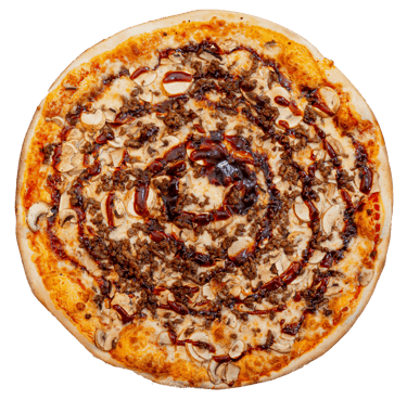 Trinti pom., sūris, malta jautiena,šoninė, kepsniu padažas,pievagrybiai, picos prieskoniai.