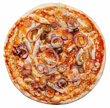 Trinti pom.,sūris,vištiena, kiaul. kumpis, krevetės, svogūnai, pomidorai, prieskoniai.
