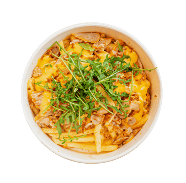 bulvių lazdelės su plešyta kiauliena, sūriu, svogūnų traškučiais 5€