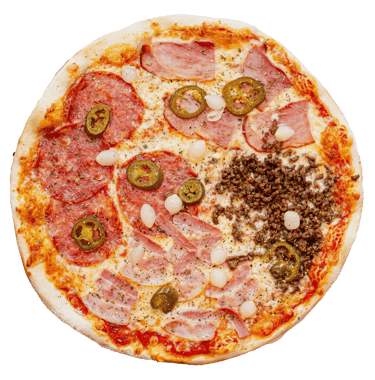 Trinti pom, sūris, saliamis, šoninė ,kiaul kumpis, malta jautien, mar.svogūnėliai, jalapenas, bbq padažas, picos prieskoniai.