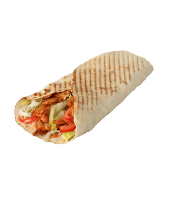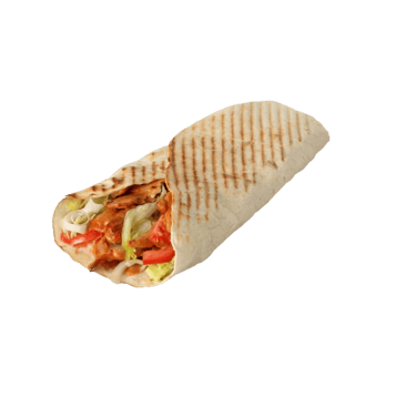 Lavašas, kebabo mėsa, sūris, kornišonai, jalapeno pipirai, svogūnai, pomidorai, padažas