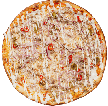 Trinti pom, sūris, vištiena, malta mėsa, svog,aitr. paprika,jalapenas, česnak. padažas, picos prieskoniai.