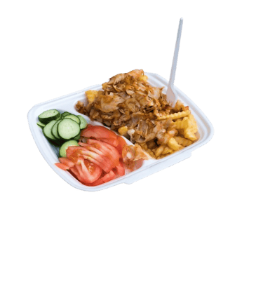 Kebabo mėsa, fri bulvių lazdelės, švieži agurkai, pomidorai, pekino kopūstai, marinuoti svogūnai, padažas